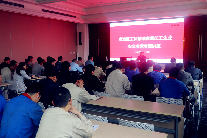 公司举行安全专题培训和消防应急演练2017-04-274月27日上午,为进一步落实企业安全生产主体责任,提升企业安全生产能力和水平,高港区安监局组织公司班组长以上管理人员及各粮油食品加工企业安全管理人员50余人,在一楼培训室召开了高港区工贸粮油食品加工企业安全专家专题讲座。培训内容包括:生产过程中的风险控制、现场危险因素的分析、相关行业的事故案例及安全标准化体系的运行等。通过此次培训提升了员工安全生产知识和自我防范意识。4月27日下午,为有效预防、控